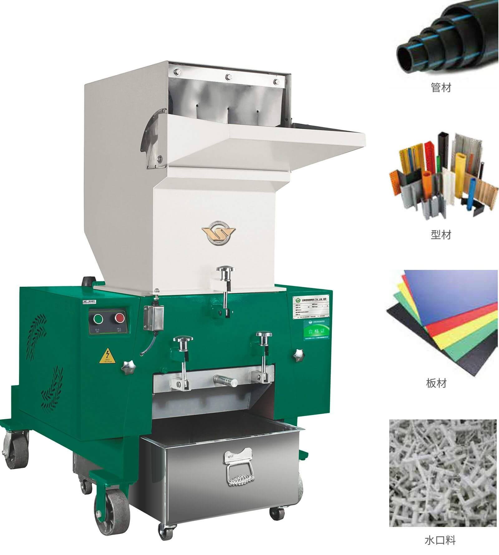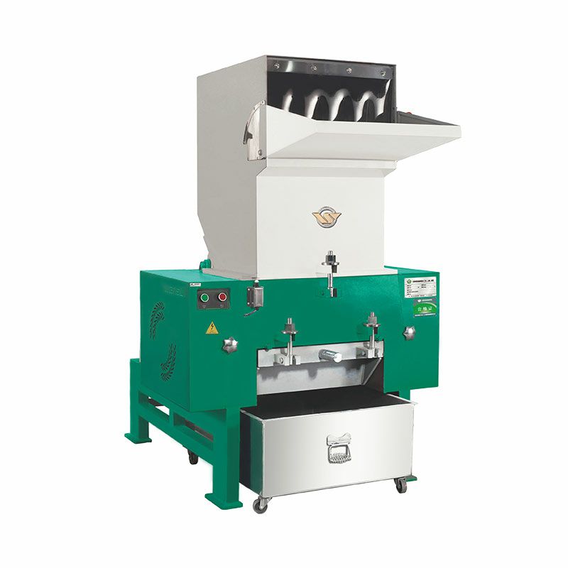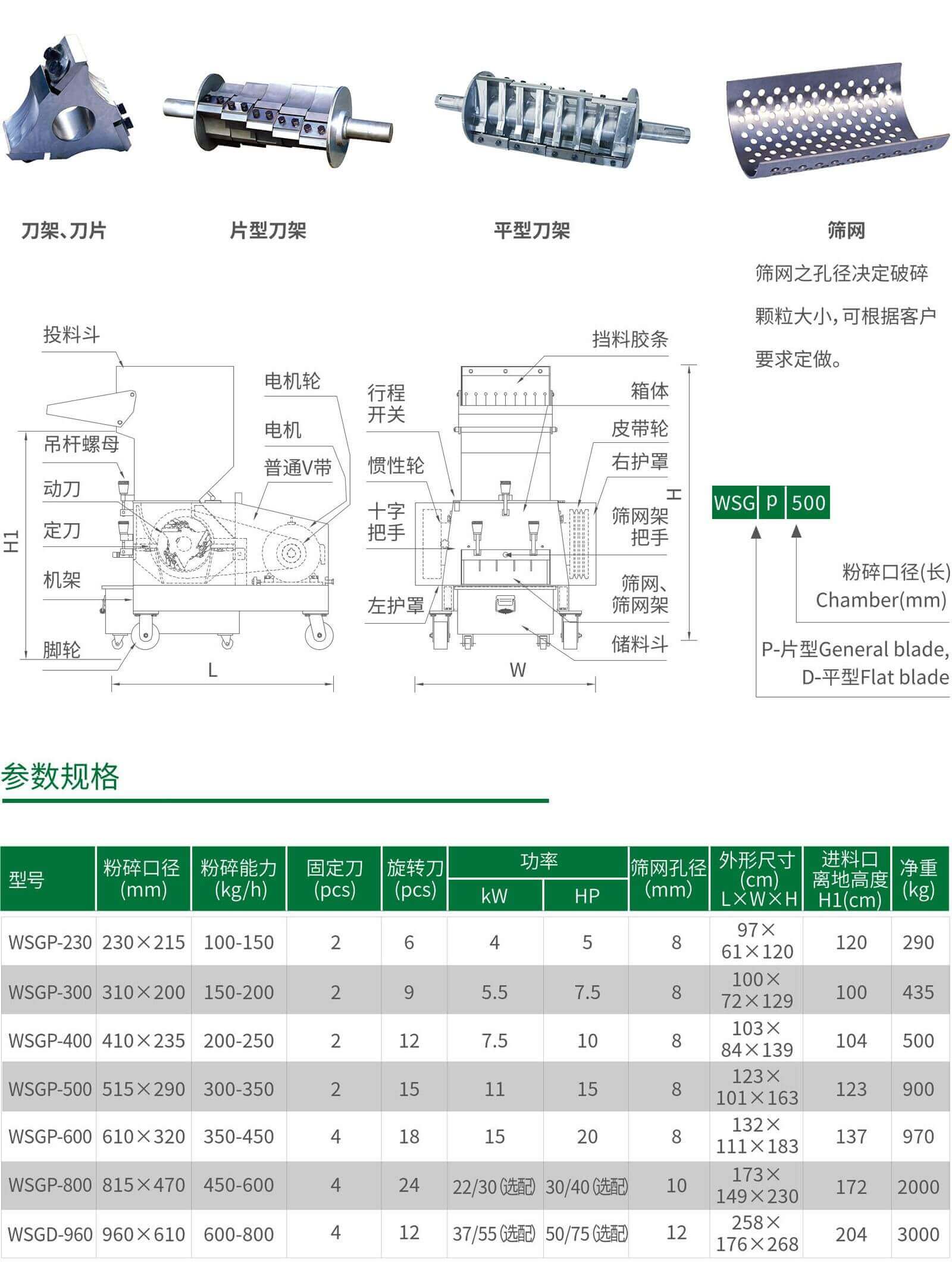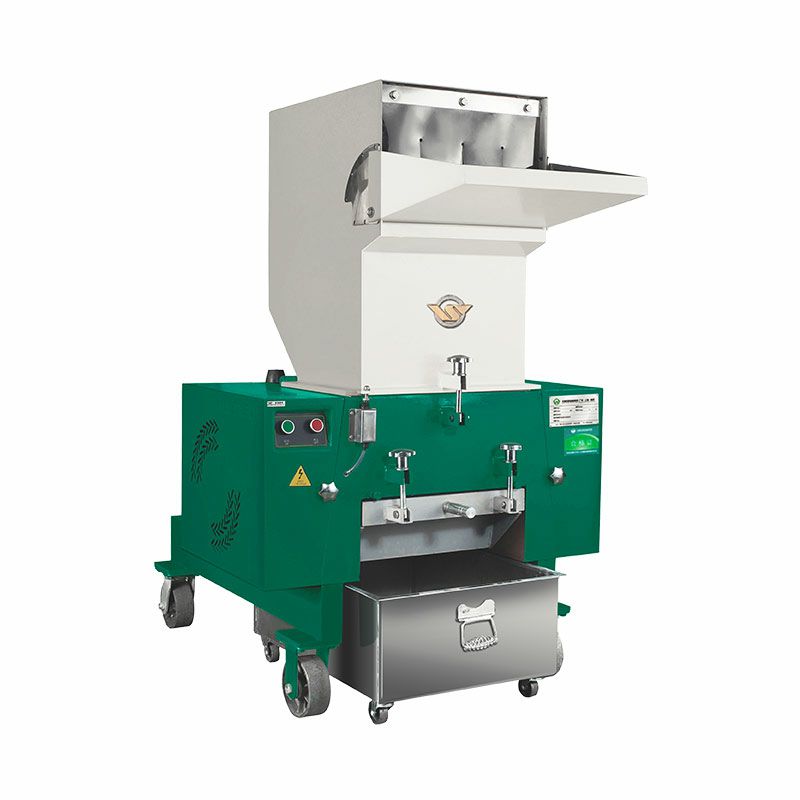 性能特点WSGP片型刀结构介于爪刀、平刀之间,适合破碎普通片材、管材、型材、板材及包装材料等塑料制品、浇道口。WSGD平型破碎机适用于箱类,薄管件,吹塑件、瓶、壳等塑料的回收。刀型设计合理,产品成粒均匀,省电耐用,高效经济。动定刀间隙可调。设有多项安全保护装置,确保操作安全。通用型塑料粉碎机,采用密封轴承,使轴承转动长时间保持良好。加工工艺成熟,箱体、刀架等重要部件采用整体加工,确保配合精度。